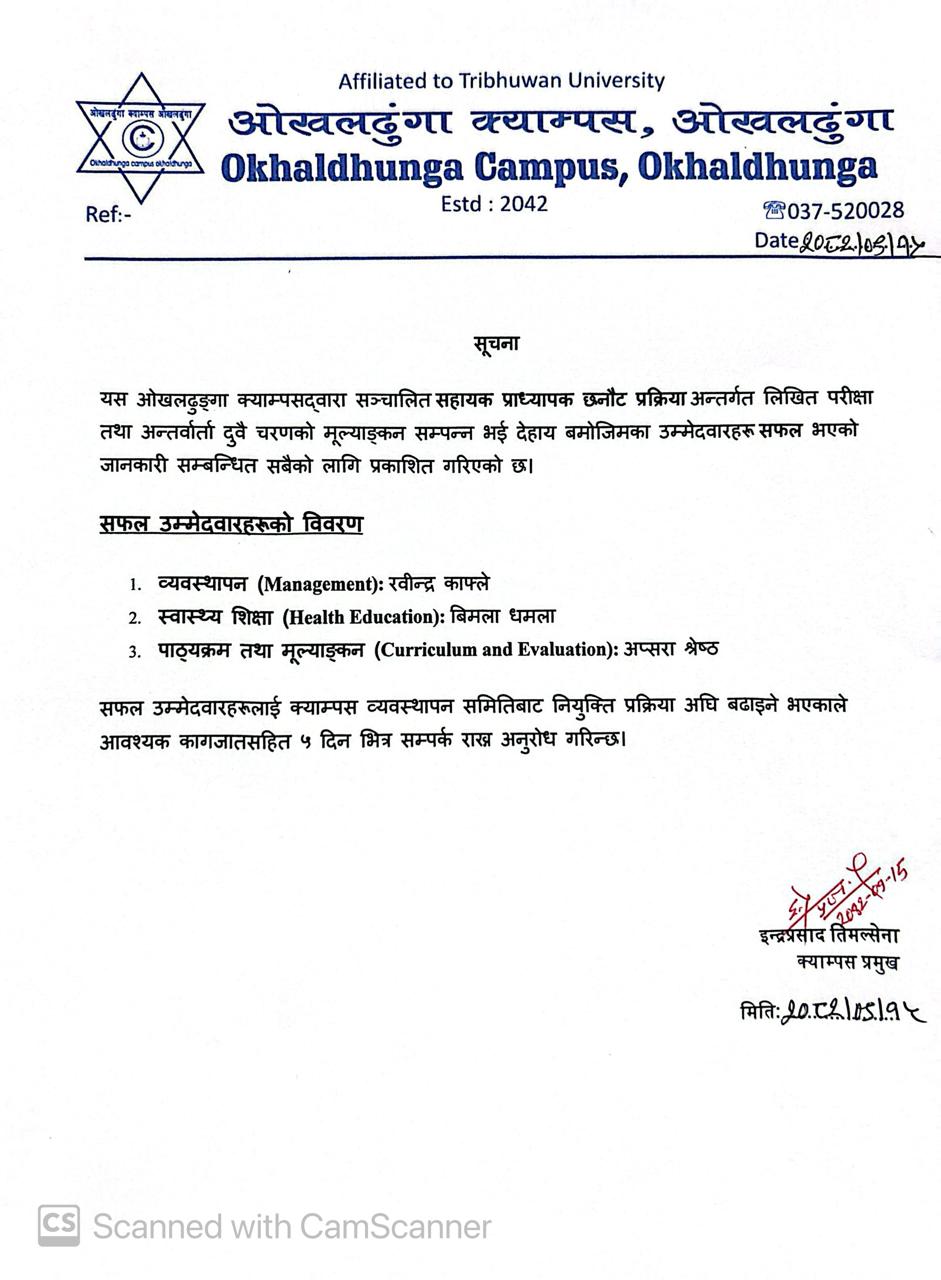Okhaldhunga Campus, Okhaldhunga is one the leading community campuses of Okhaldhunga District. It was established in 2042 B.S. by social activists and academicians of this region. It is located at the heart of Siddhicharan Municipality in Ward Number -12.